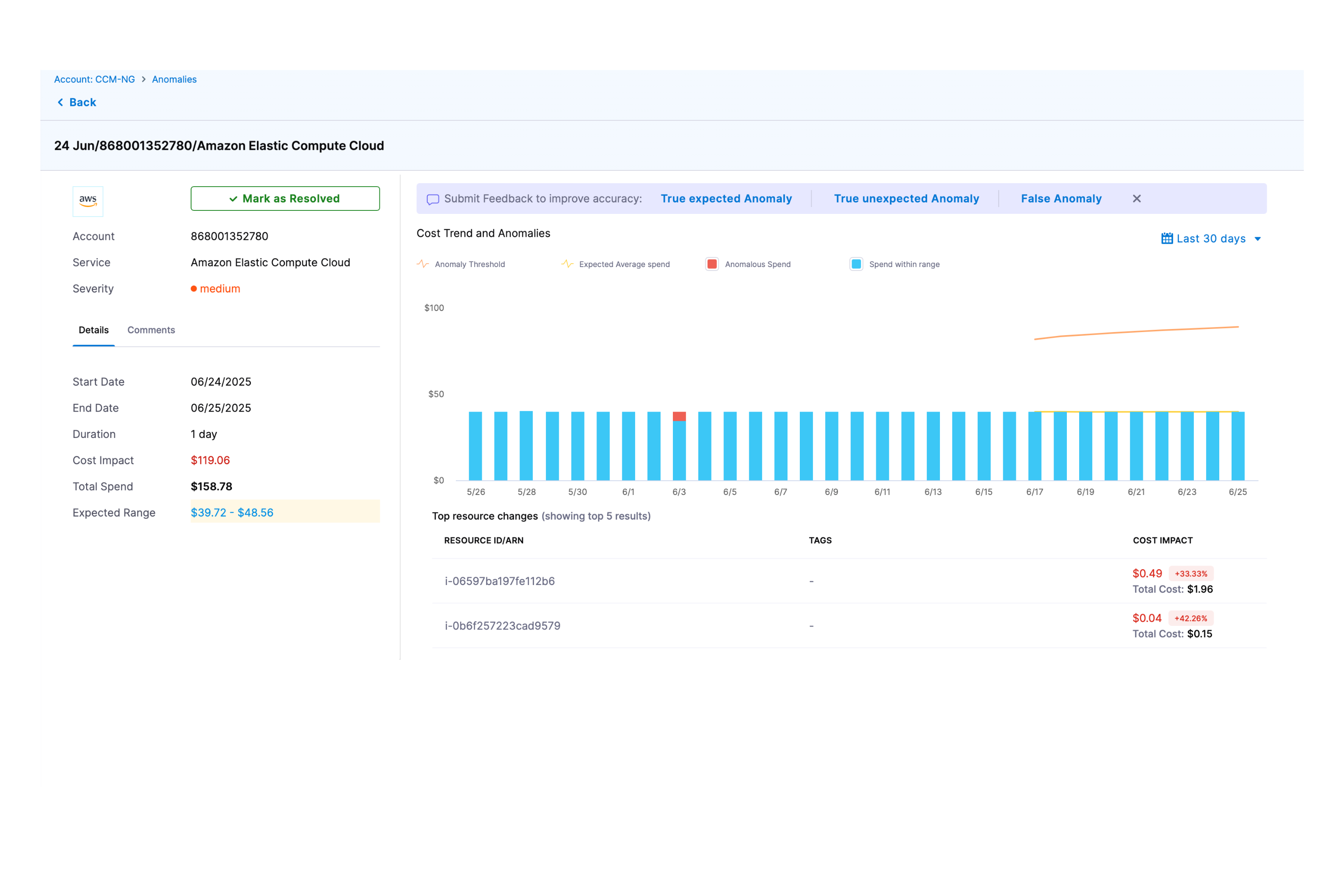 Once an anomaly is detected, for each of the anomaly detected, CCM provides insights into what are the resources which might be causing the anomaly.