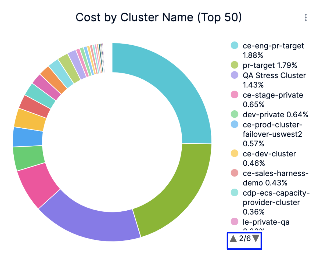 5. In Cost by Cluster Name (Top 50), click the up or down arrow button to scroll up or down the list. The list shows the percentage of each account with respect to the cost contribution.