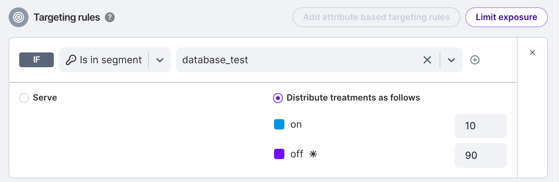 Perhaps you want to only allow a portion of your users into an experiment, maybe to reduce the risk of a new feature by exposing it to only a smaller set of your overall population. A simple way to do that is to use limit exposure. You can set the treatments to 50/50 but only send a percentage of the visitors to the rules, with everyone else going to the default treatment, as shown below. By increasing the exposure limit you add more users to the test.