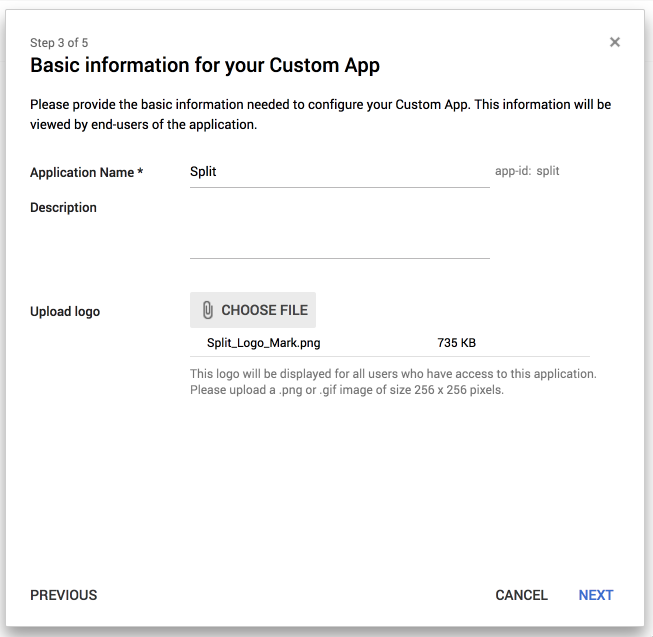 Enter the Application Name and Description, add the Split logo, and then click Next.
