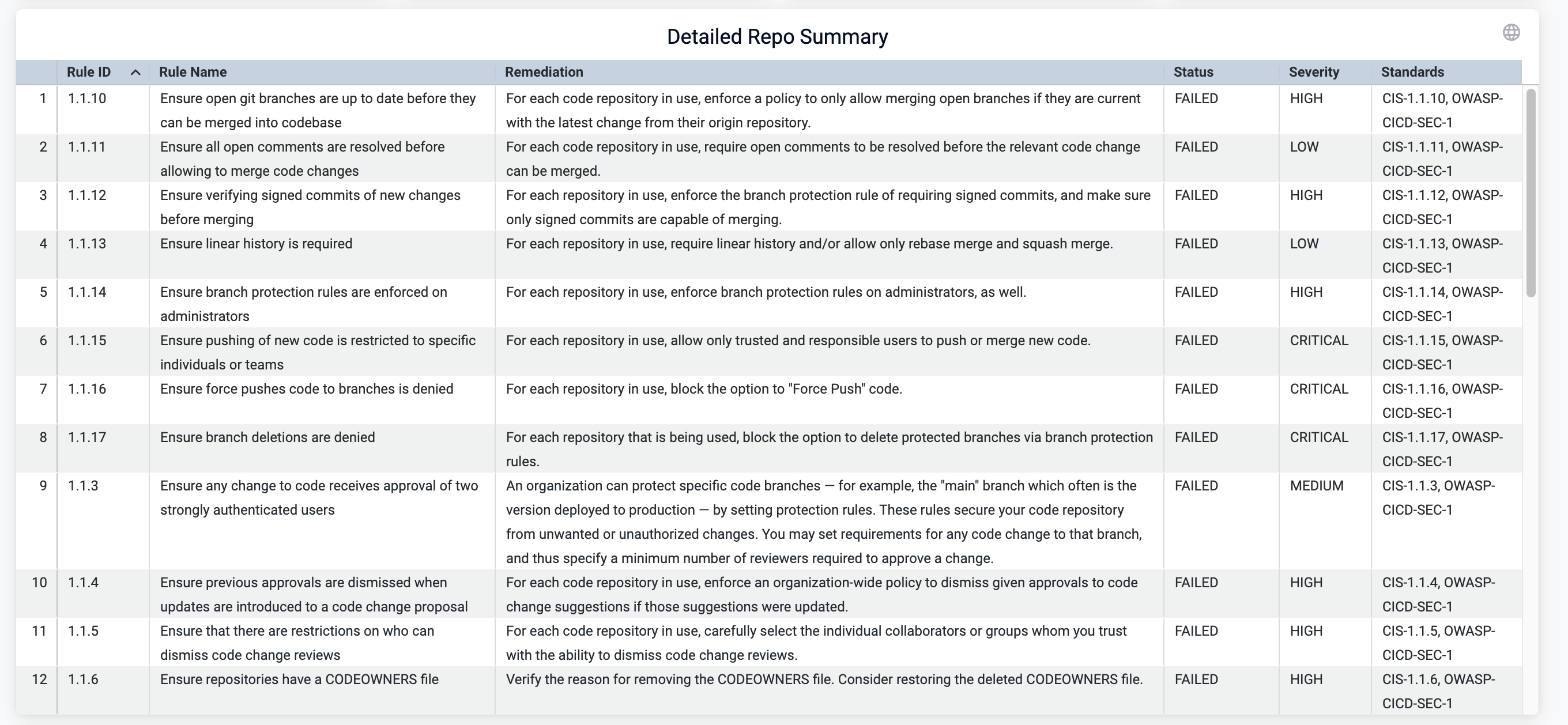 Provides a breakdown of all evaluated compliance rules, showing the number of repositories that passed or failed each rule which helps to pinpoint compliance gaps across standards like CIS and OWASP.